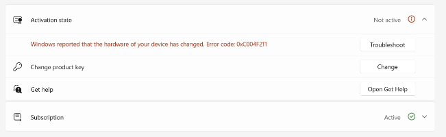 Click on the Troubleshoot option in the Activation settings. If you recently changed hardware, select "I changed hardware on this device recently" and sign in to your Microsoft account linked to the digital license