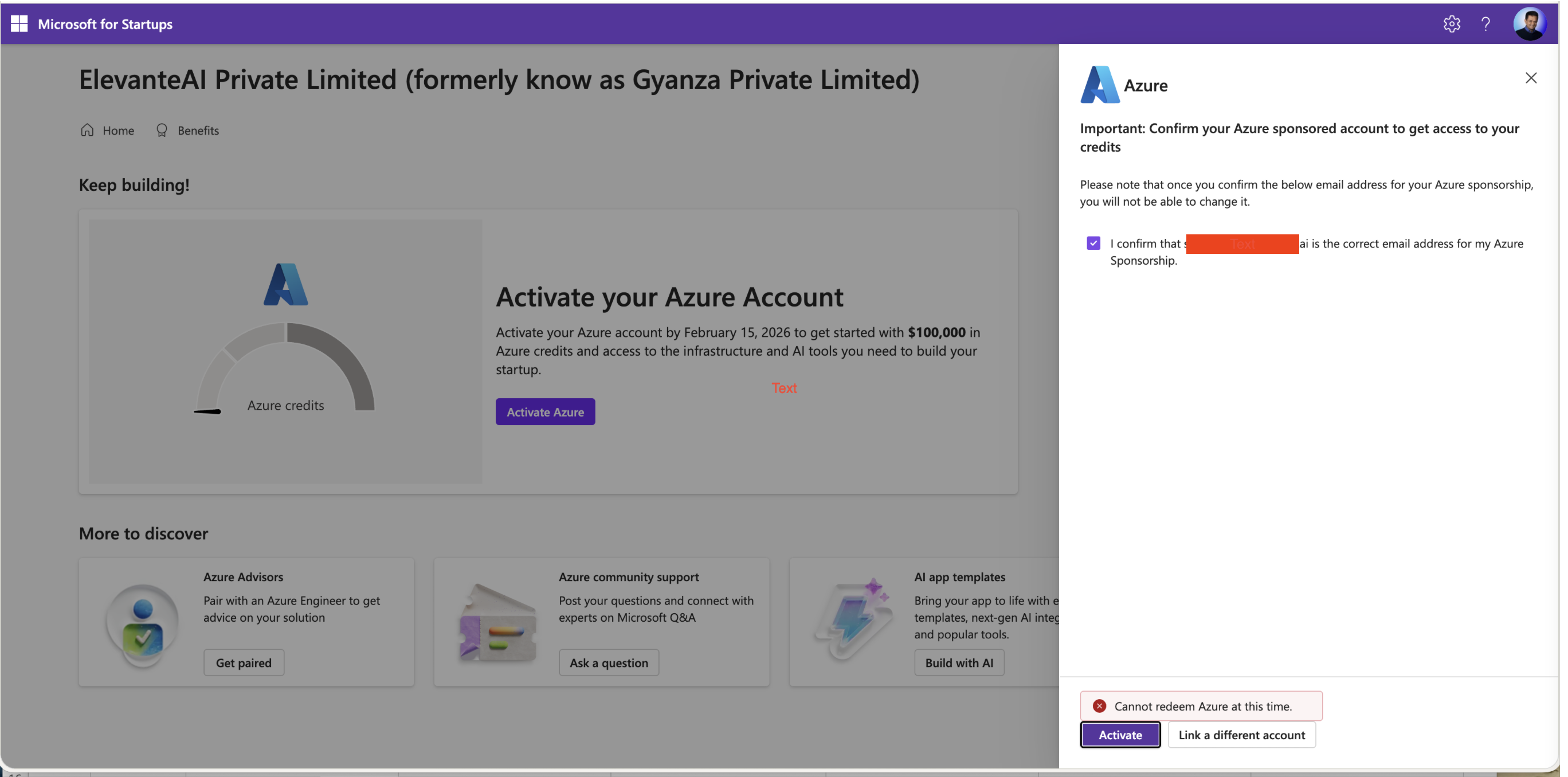 Please can you try again with activating those Azure credits?