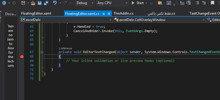 you can use in a VSTO add‑in to make a WPF TextBox overlay over the active Excel cell receive KeyDown/TextChanged reliably. It addresses Excel’s focus‑stealing during selection changes and in‑cell edit mode.