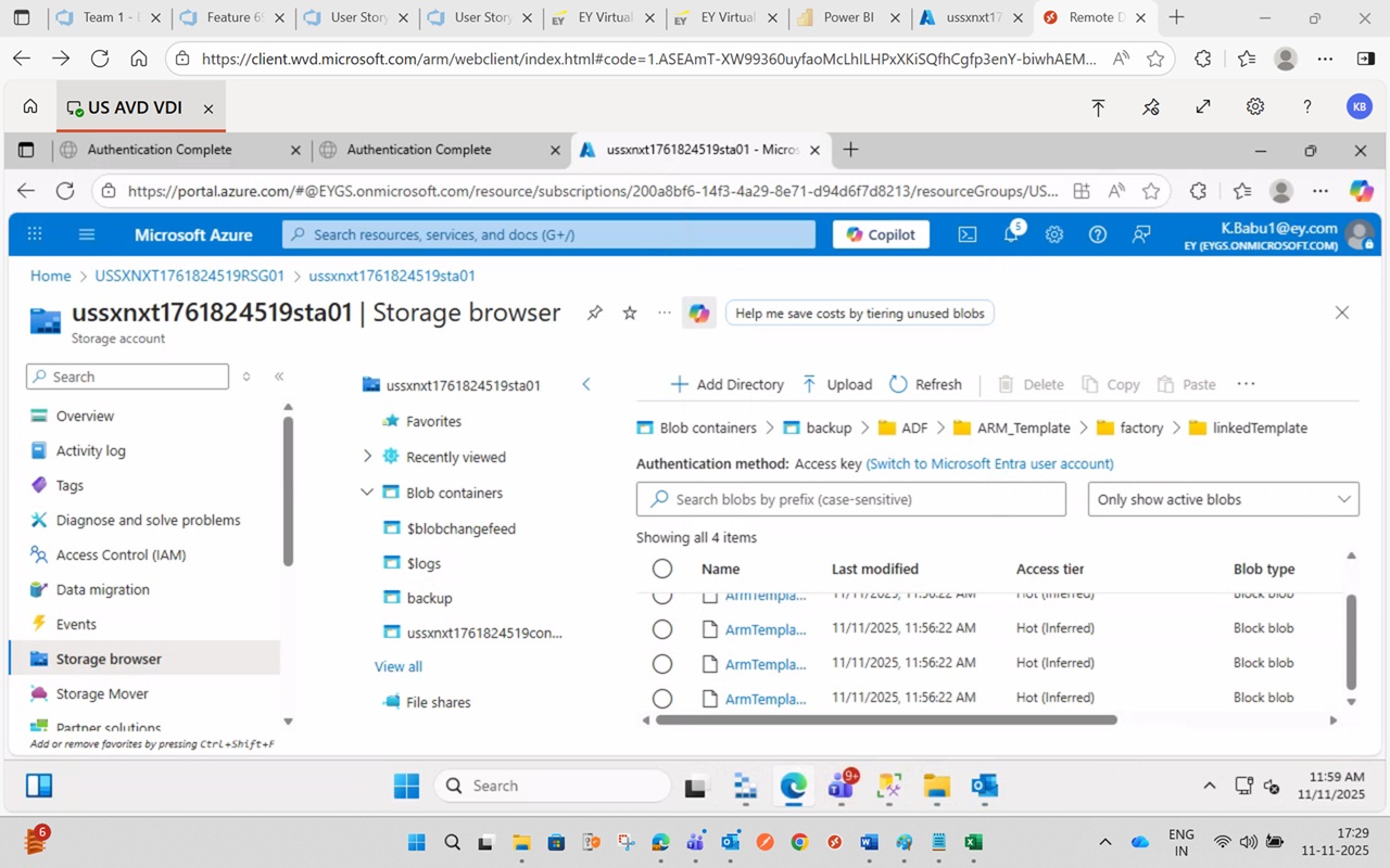 1. Permissions: Ensure that you have the necessary permissions to upload files to the Blob Container. You may need to check your role assignments in Azure to confirm that you have the appropriate access rights.