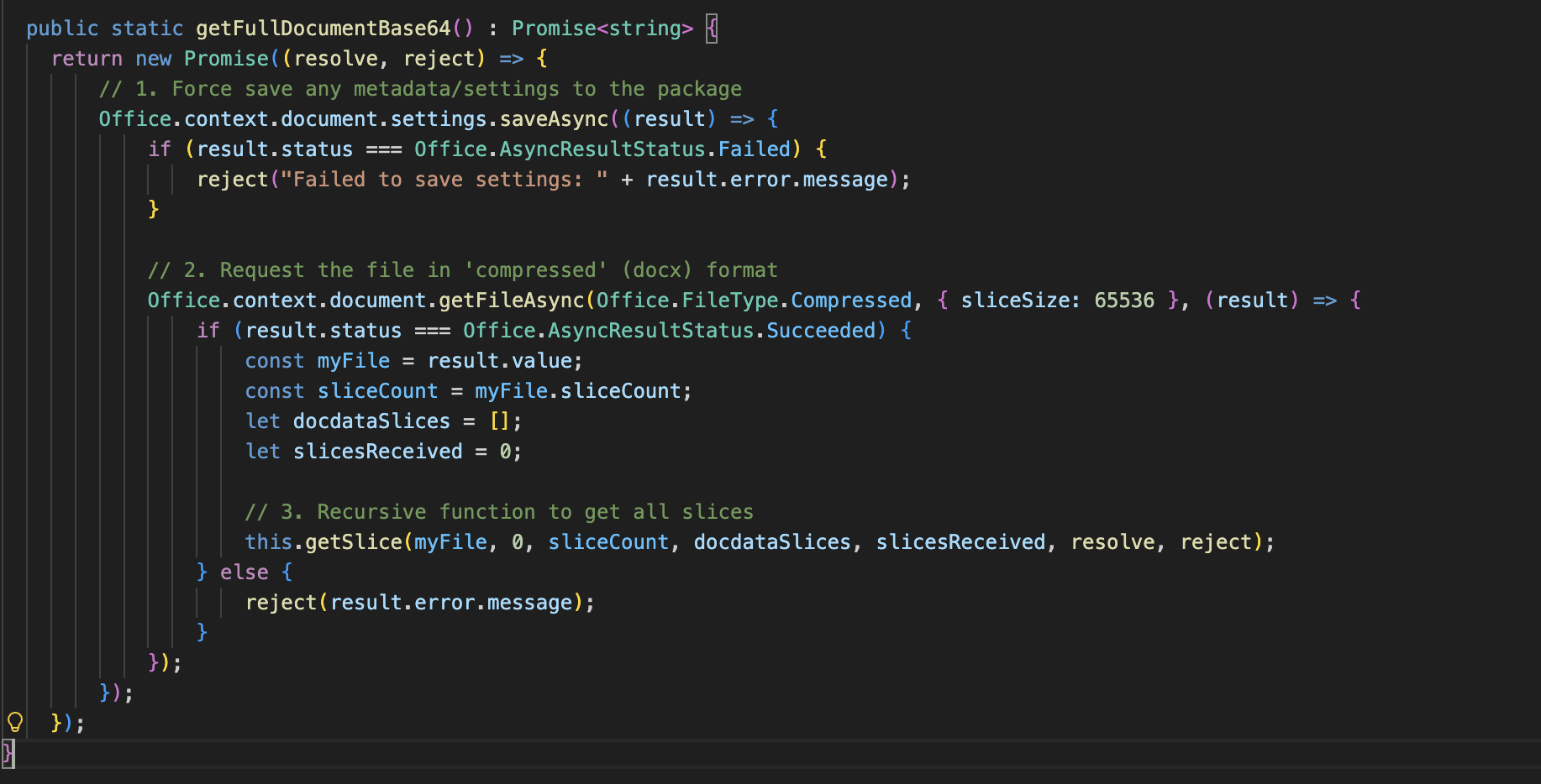 When using Office.context.document.getFileAsync(Office.FileType.Compressed, …) in Word, the returned DOCX package may sometimes be missing the word/webextensions folder. As a result, any add‑in settings stored via Office.context.document.settings which are persisted into webextension1.xml won’t appear in the Base64 output. This behavior has been reported in Custom settings are not present in files retrieved using getFileAsync() · Issue #6434 · OfficeDev/o…