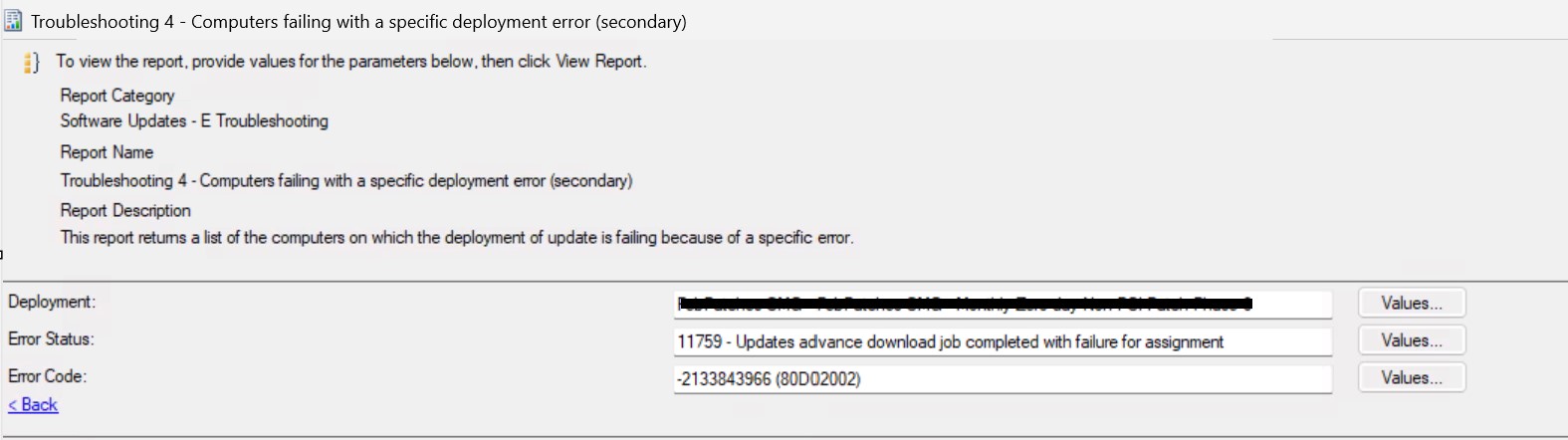 Please share the SCCM SQL query to get the report of computers failing with specific error code for a software update deployment.