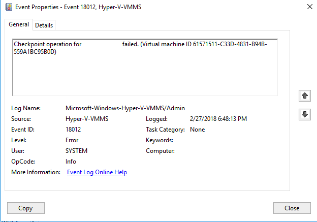 3.Sometimes there is a problem with performing a backup. The problem is connected with a problem with performing a checkpoint of the VM. The operation ends up with above errors. The reason is that folder permissions with disk files are not properly granted. To be precise VM does not have permissions to its own disks folder.