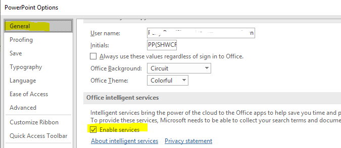 Please open File > Options > General. Check the option “Enable service” under Office intelligent service. Restart PowerPoint to see if it works.