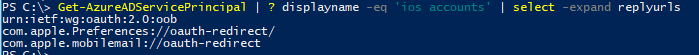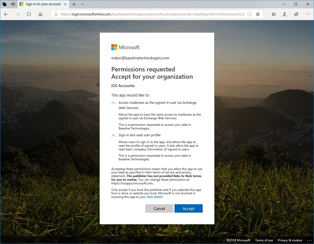 This will allow a global admin to approve the "ios accounts" app. After clicking accept, you'll be asked how you want to open the oauth application, but you can ignore that. apple doesn't offer a valid redirect url off the iphone but you can confirm your success by visiting this site and looking for "ios accounts":