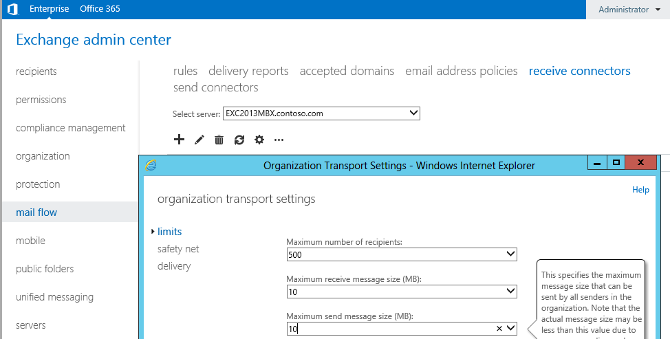 Set-transportconfig -maxsendsize 50mb -maxreceivesize 20mb