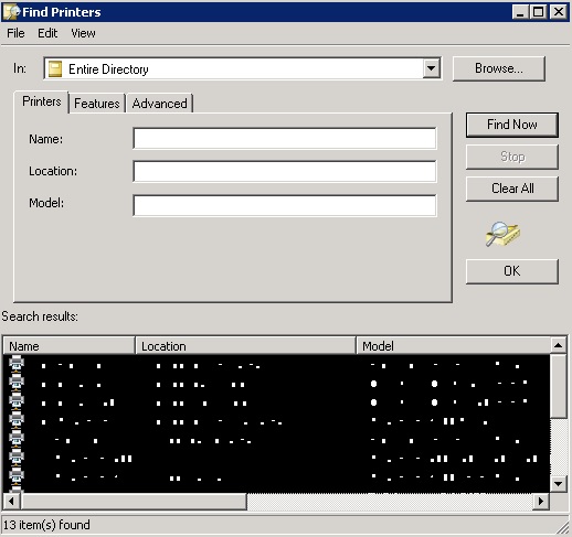 In the example I blocked out the names and locations of the printers that appear in the directory. I was just trying to show that in the simple network search for the printers, nothing appears (first screen). But when you search the entire directory on the subsequent pages, it populates and shows 13 network shared printers from the primary print server as well as other localized shares (second screen).