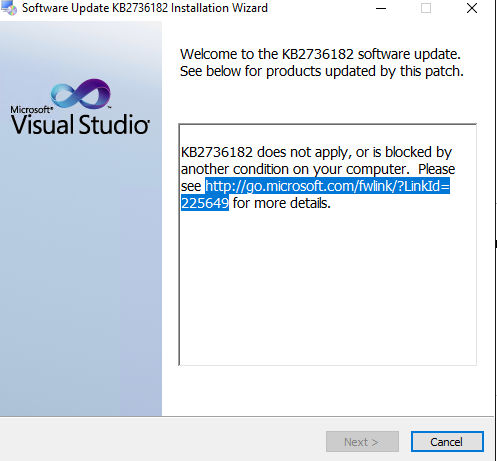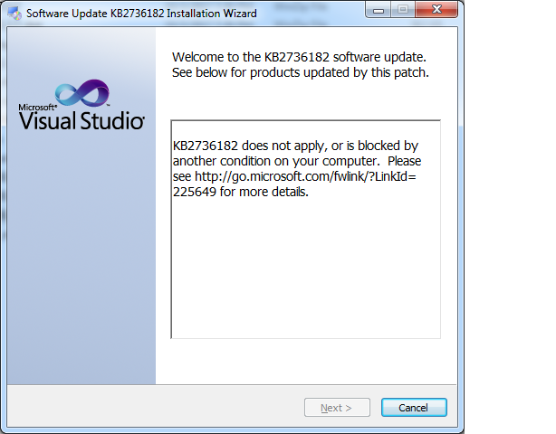 we Installing Visual Studio 2010 SP1 (KB2736182) showing error " KB2736182" does not apply, or is blocked by, another condition, on your computer.