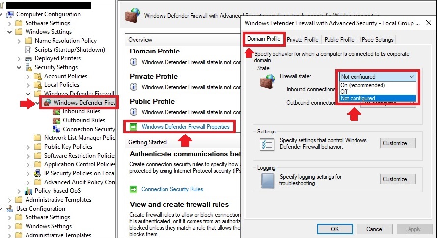 I was in these settings last night. I tried changing the firewall domain profile to off and not configured and then running gpupdate /force. Unfortunately, there is no difference in the Windows Defender Firewall settings. I still cannot turn the domain firewall off.
