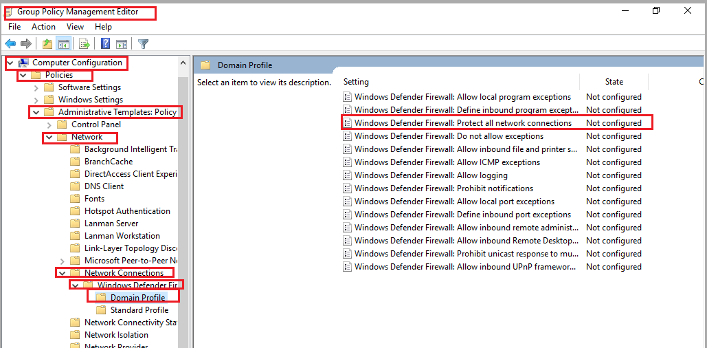 Open the “Group Policy Management” console, create a new GPO, find>> Computer Configuration->Policies->Administrative Templates: Policy …->Network->Network Connections->Windows Firewall->Domain Profile.