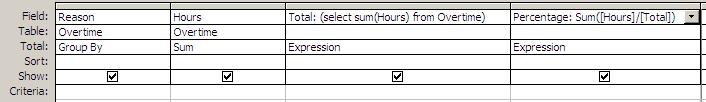 SELECT Overtime.Reason, Sum(Overtime.Hours) AS SumOfHours, (select sum(Hours) from Overtime) AS Total, Sum([Hours]/[Total]) AS Percentage