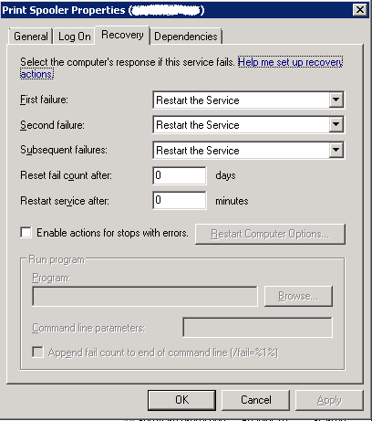 Why I'm asking these three questions is the Print Spooler service of my print server is often somehow down unexpectedly. I want it will start automatically after failures.