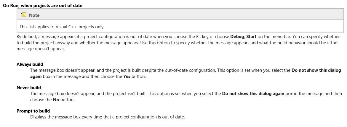 i don't understand in what way any of these options would help me to find out, what makes vs think the project is out of date. With these options, i can make it discard the message box, or use the old build etc - but what i want to know is, _why_ it thinks a project is out of date so i can correct this problem.