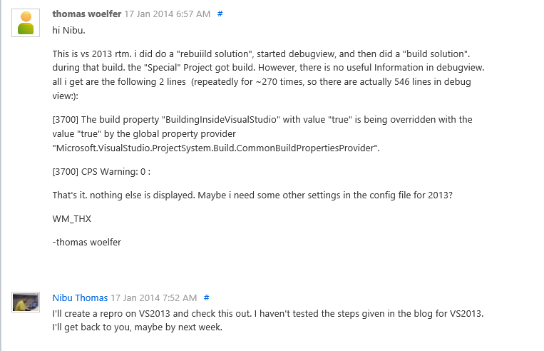 i edited the config file as described, restartet vs, and launched debugview. vs _will_ log a lot of stuff indeed. however, i did a "rebuild" and than cleared debugviews Display. i next hit "run with Debugger" inside vs. again, visual Studio told me one of my Projects was out of date, but there was absolutely _no_ Information displayed in debugview. maybe i'm doing something wrong? Or maybe some implementation Detail in vs changed and the description in the blog post is longer valid?