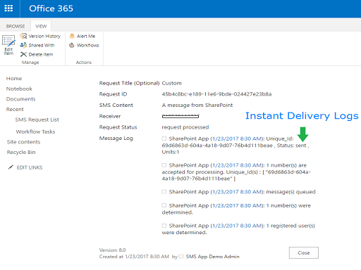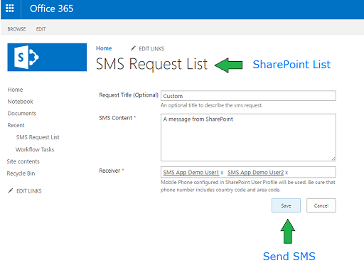 - Install the add-in and you will get a SharePoint list in your site, where you can start sending SMS.