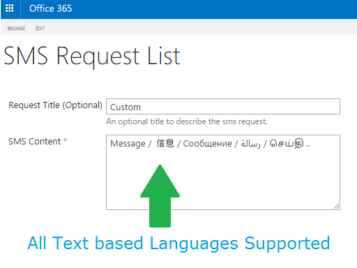 SharePoint App Store has an App (add-in) : SMS for Office (Send SMS Via SharePoint List)