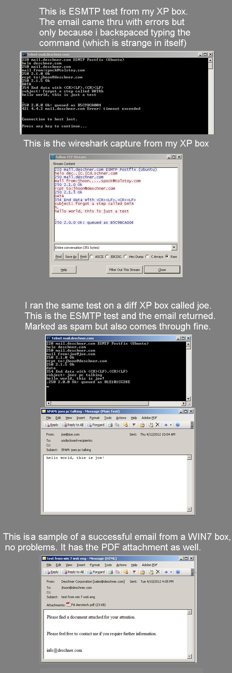 Here is the mystery, the email text AND attachments are sent properly using the WIN7 clients, but the XP client's emails arrive without the attachment, with error: