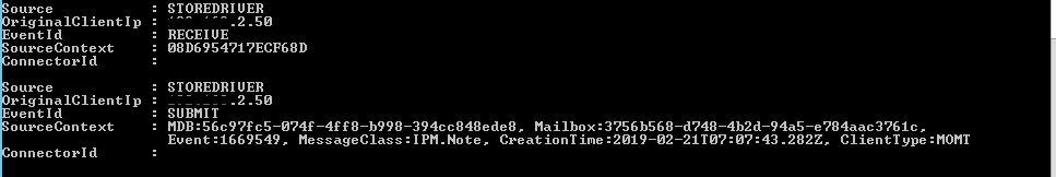 We already went through getting the info from the Get-MessageTrackingLog -messageID: MESSAGEID –Recipients RECIPIENT -EventID Receive | FL