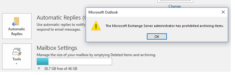 "The Microsoft exchange server administrator has prohibited archiving items"