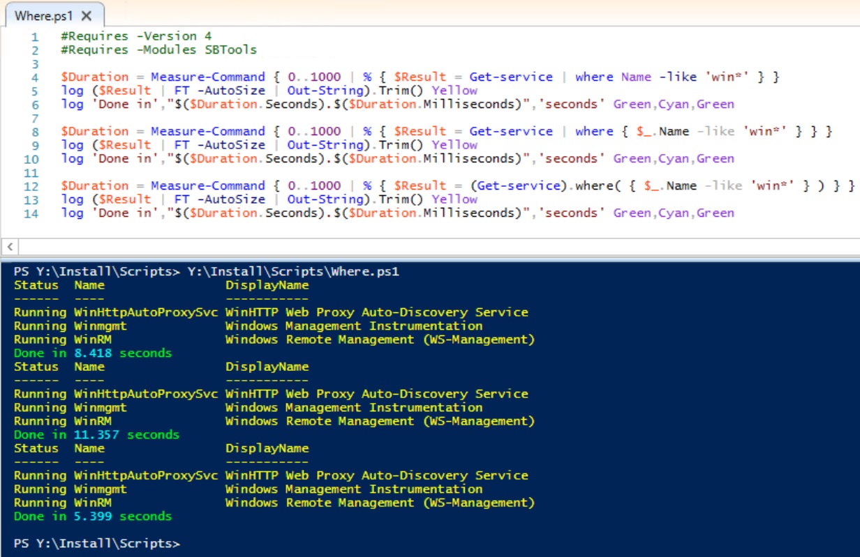 $Duration = Measure-Command { 0..1000 | % { $Result = (Get-service).where( { $_.Name -like 'win*' } ) } }