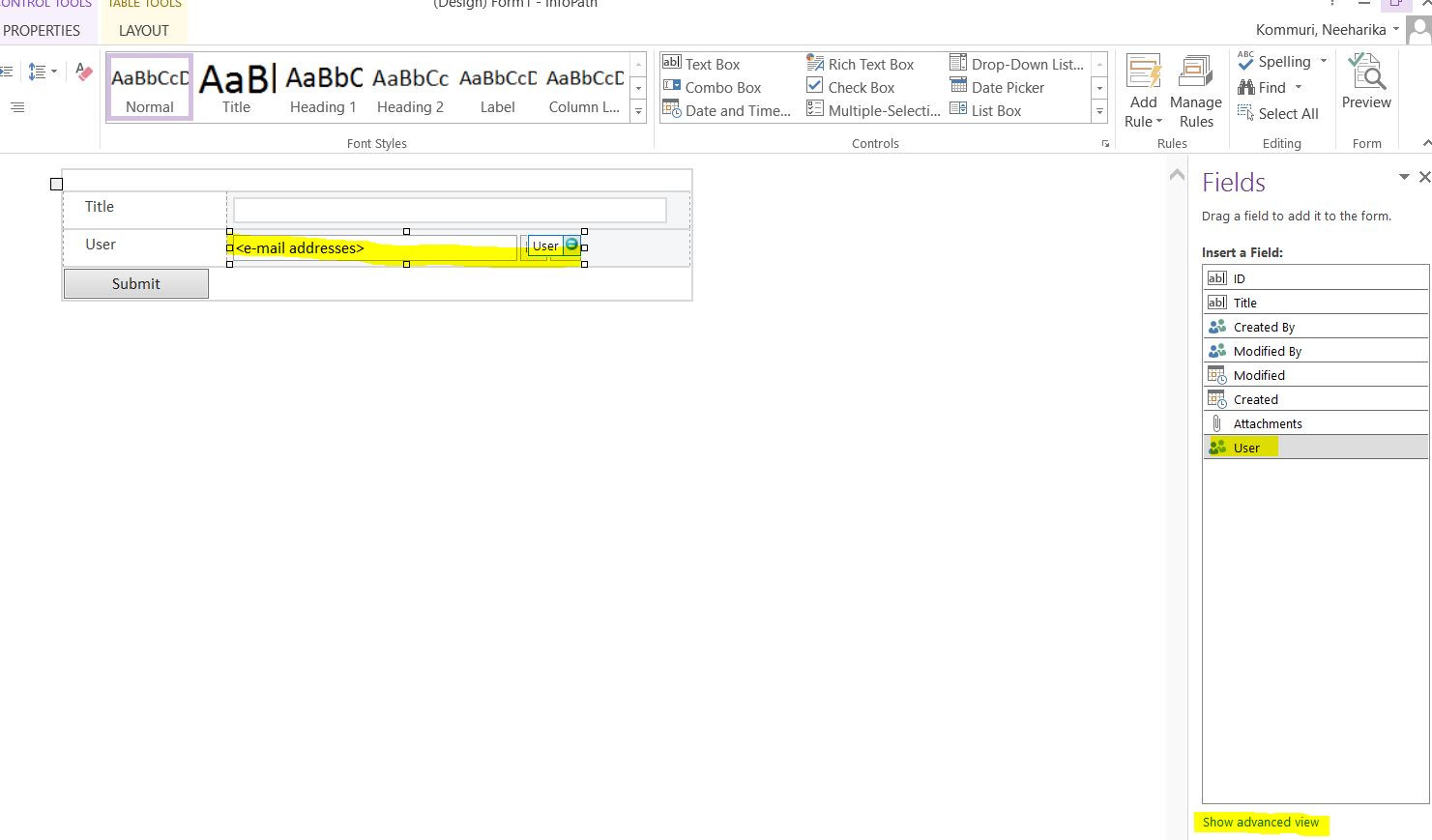 5. Add a people picker control and other control as you want to use in the form.