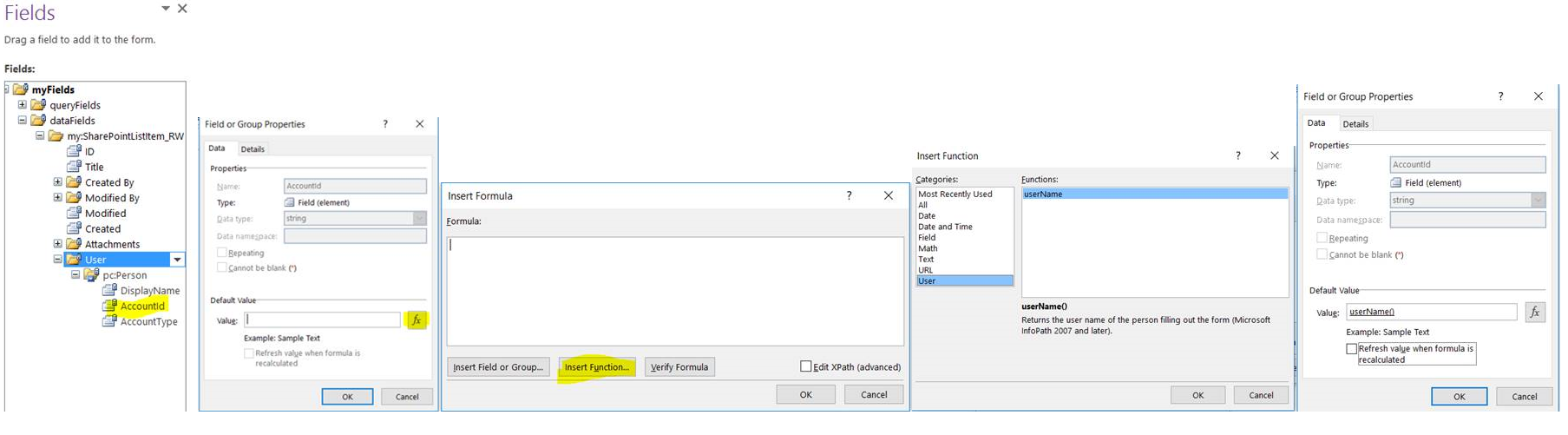 Click on (+) for expansion->First right click on AccountId properties->click on fx->click on insert function->User->username->click ok button->ok->ok