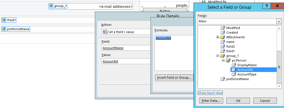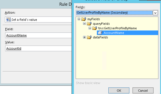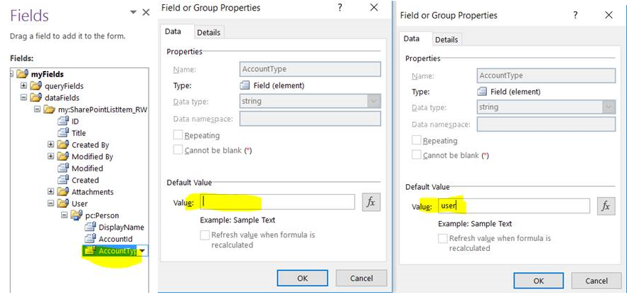 Now come back infopath design path again on right hand side Fields-> now right click on AccountType->right click on properties->in value text box->just type-user->click ok button.