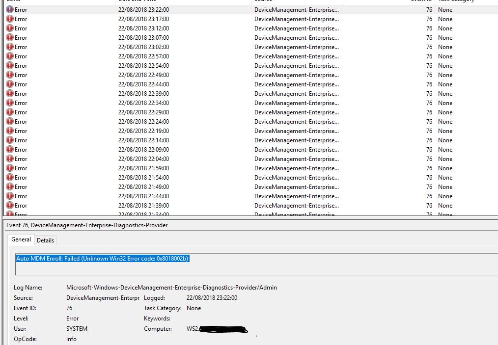 - Checked event log for anything meaningful - seeing 'Auto MDM Enroll: Failed (Unknown Win32 Error code: 0x8018002b)' as per the OP.