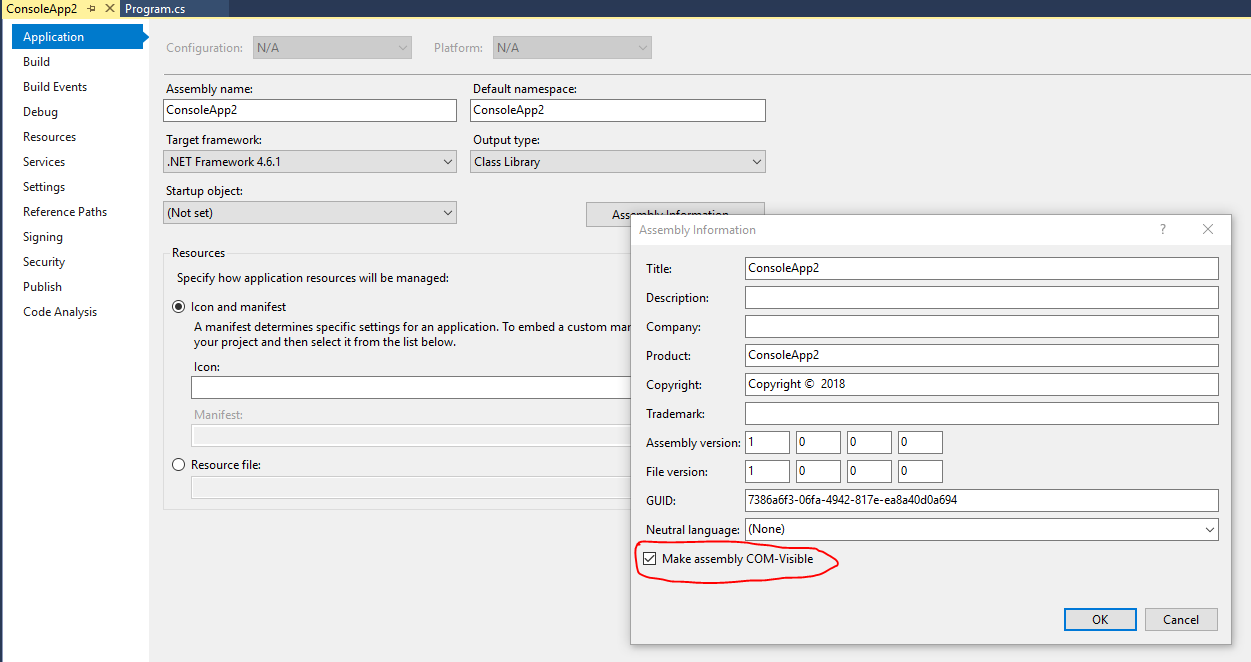 When i go to my Assembly information for a C# project with an output type of Class Library, my option for "Make assembly COM-Visible is greyed out. How can I get this option available? I am running VS 2017 Community.