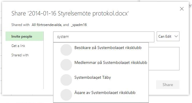 5. Select another document (document B) -> Share -> Specific people -> typing the name of the group, we can get this group.