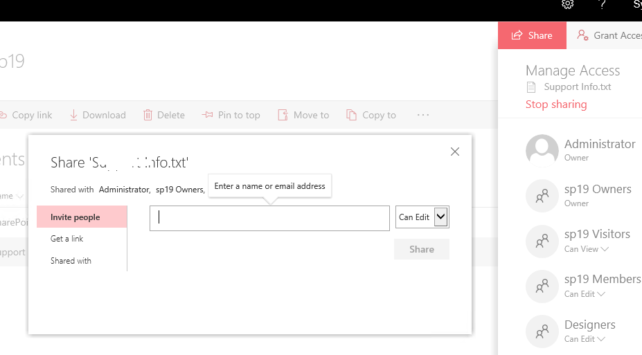 4. Select a document (document A) -> Share -> ellipses icon -> Manage Access -> Grant Access -> In “Invite People” panel, type “test group” and click on Share -> Shared successfully.