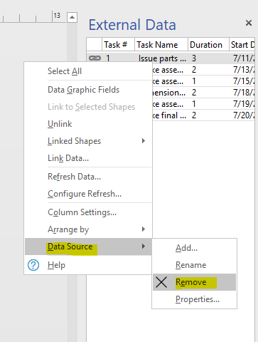 To remove the data source in Visio, please display the External Data Window, then right-click it, select Data Source > Remove.