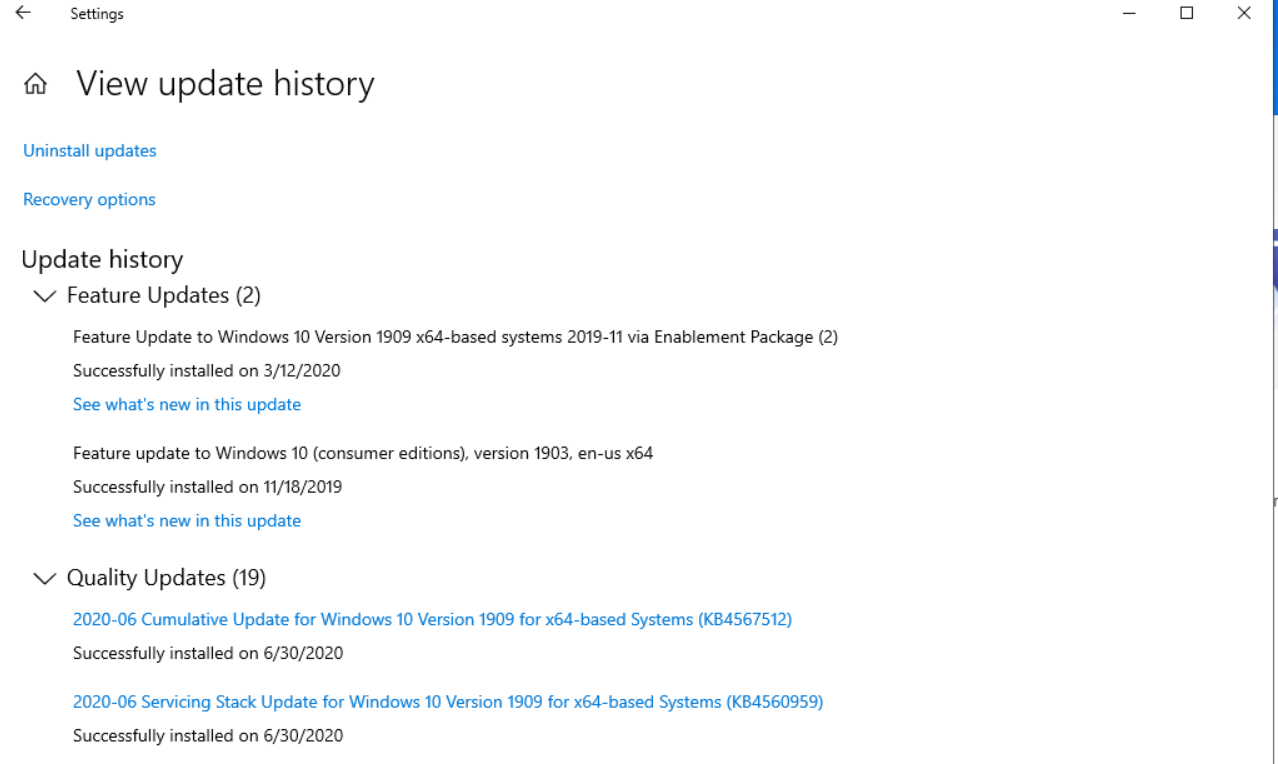 We are having continual issues with the Cumulative Updates applying properly to our client systems. We are using Windows 10 Pro 1909 with WSUS. This has happened with the March, April, and June Cumulative updates so far, that we have noticed.