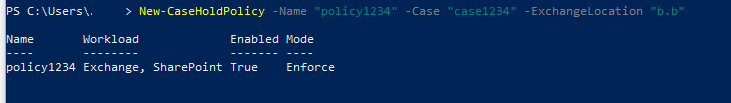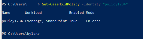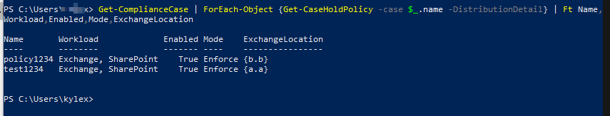 Get-ComplianceCase | ForEach-Object {Get-CaseHoldPolicy -case $_.name -DistributionDetail} | Ft Name,Workload,Enabled,Mode,ExchangeLocation