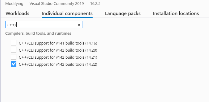 >> Note: For VS2019, you should install this components C++/CLI support for v142 build tools at the begin.