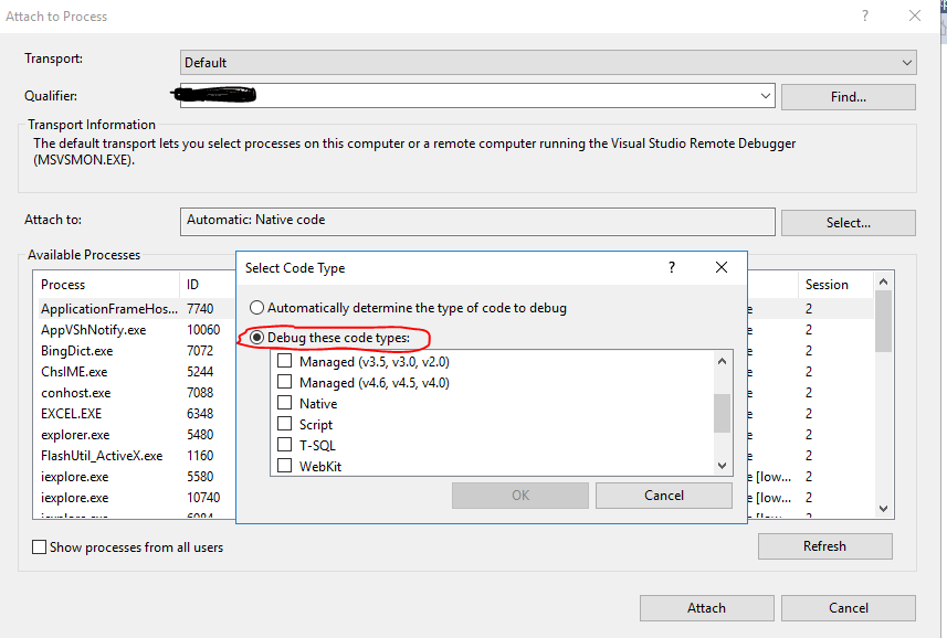 Based on the error messages, it seems that it is related to the debug types you select in the attach to process window. Maybe you could check/change the debug code type in your side.