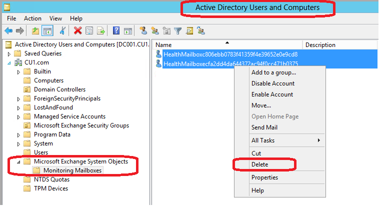 3. Please try to open ADUC and located the Monitoring Mailboxes folder, then select and delete them. Pic as below:
