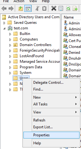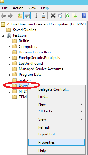 - Open ADUC on DC, and right-click the properties of Users tree;