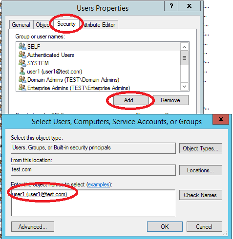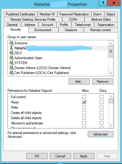 Thank you very much for your reply, as well as the screenshots. I've tried to implement this but it seems to go wrong. I navigated to ADUC, enabled the Advanced Features in the View tab so that I could see the security tab in user properties.