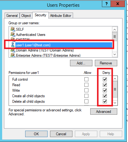 Then click OK. After doing all this on DC, please go to a client computer and reboot it, then log in with the user account which you have set the deny permission and run the net user /domain command to see if it works as my test did.