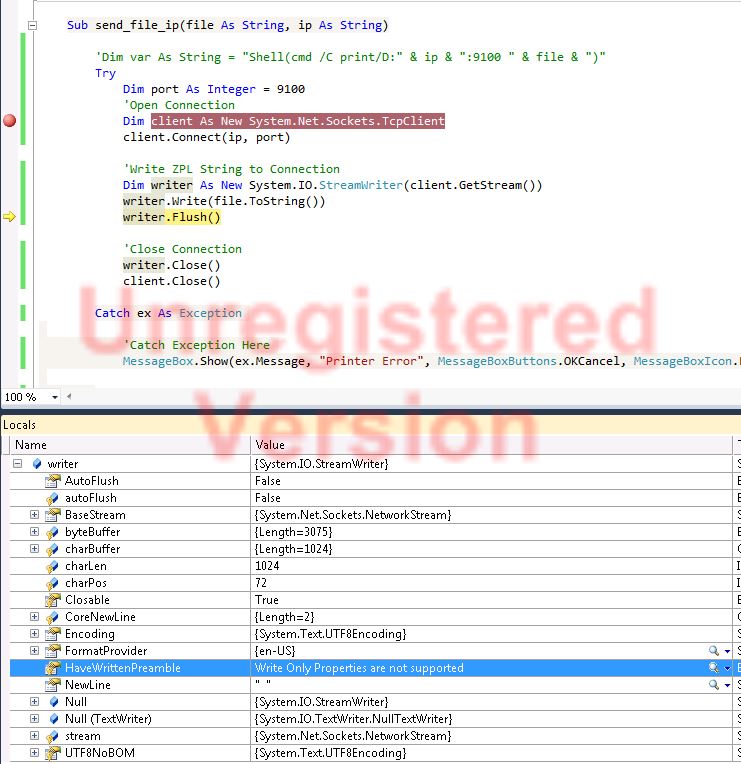 I have been researching on how to write a text string directly to a ZEBRA 105SL Label printer and found a solution that is clean and easy, but I have an issue concerning the SOCKET.