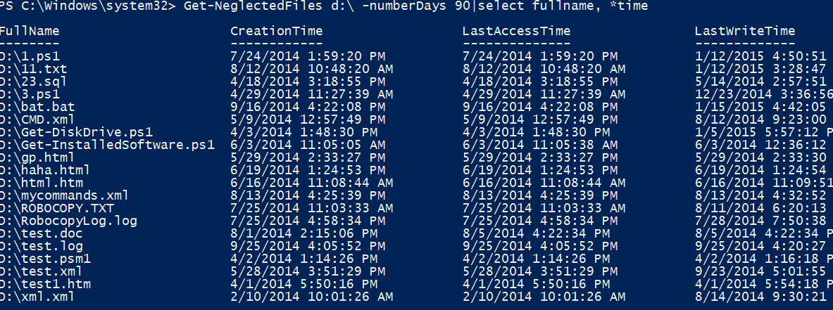 Get-NeglectedFiles d:\test -numberDays 90|select fullname, *time