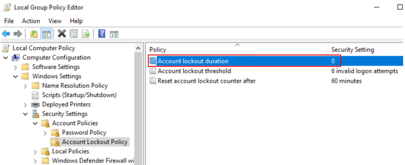 But what I need to do is to set the lockout duration to "Never, while the lockout window/threshold set to 1.