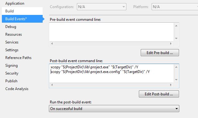 xcopy "$(ProjectDir)\lib\project.exe.config" "$(TargetDir)" /Y