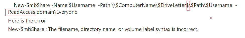 + New-SmbShare -Name $Username -Path \$ComputerName\DriveLetter$ ...
