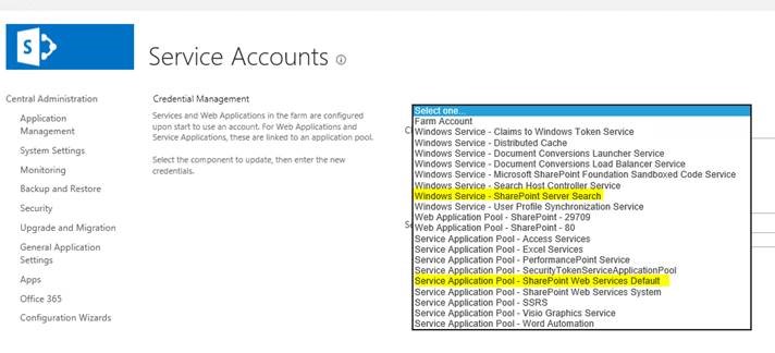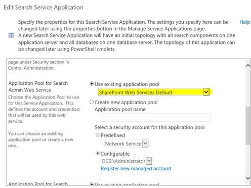 Then go Security>configure service accounts. Choose the search service and the application pool holding search admin web service. Change the account to the one you want.