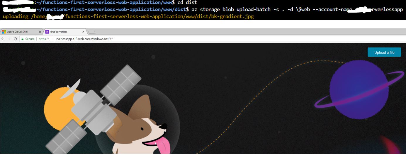 PS /home/username/functions-first-serverless-web-application/www/dist> az storage blob upload-batch -s . -d \web --connection-string $ConnectionString