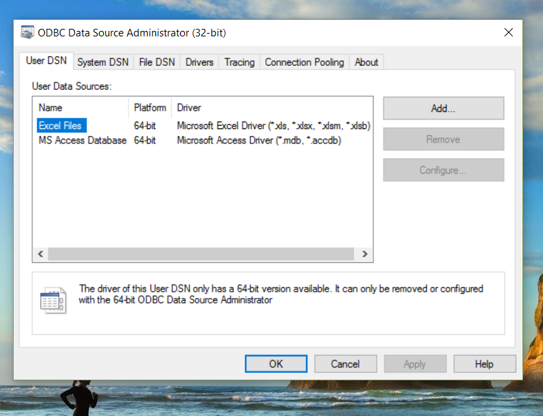 Unable to create DSN for Microsoft Office System Driver on 64-bit versions of Windows