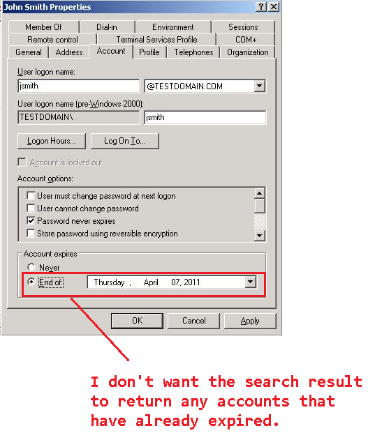 I am trying to populate the contact table of an application. I want import all enabled Active Directory user accounts, but not those that have expired.
