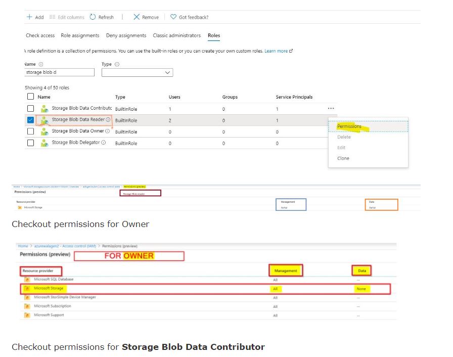 Only roles explicitly defined for data access permit a security principal to access blob or queue data. Roles such as Owner, Contributor, and Storage Account Contributor permit a security principal to manage a storage account, but do not provide access to the blob or queue data within that account.